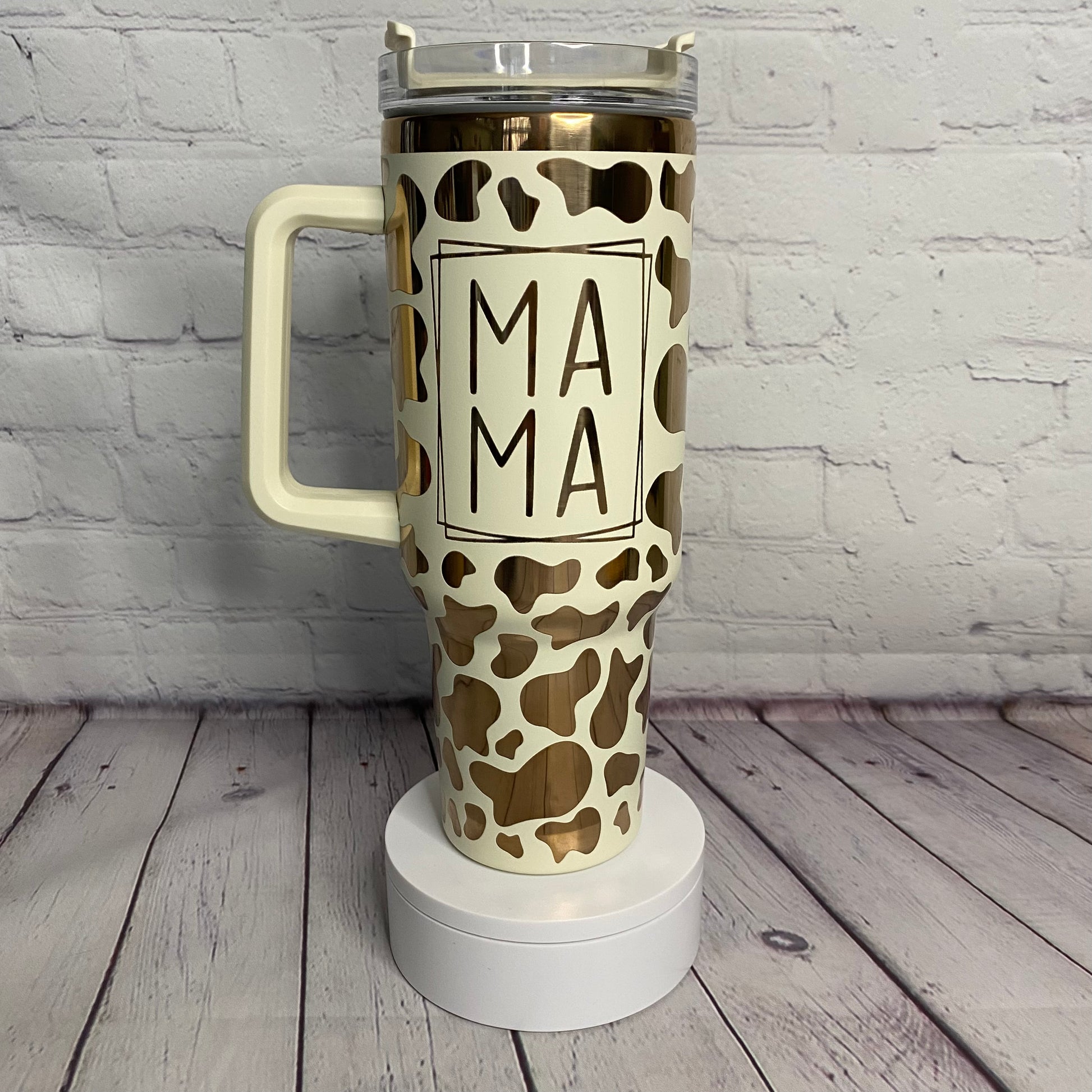 Calling all stylish mamas out there! Elevate your beverage game with our laser engraved cow print 40oz copper tumbler. This stunning tumbler combines fashion and functionality, with its eye-catching copper cow print. Lid and straw included