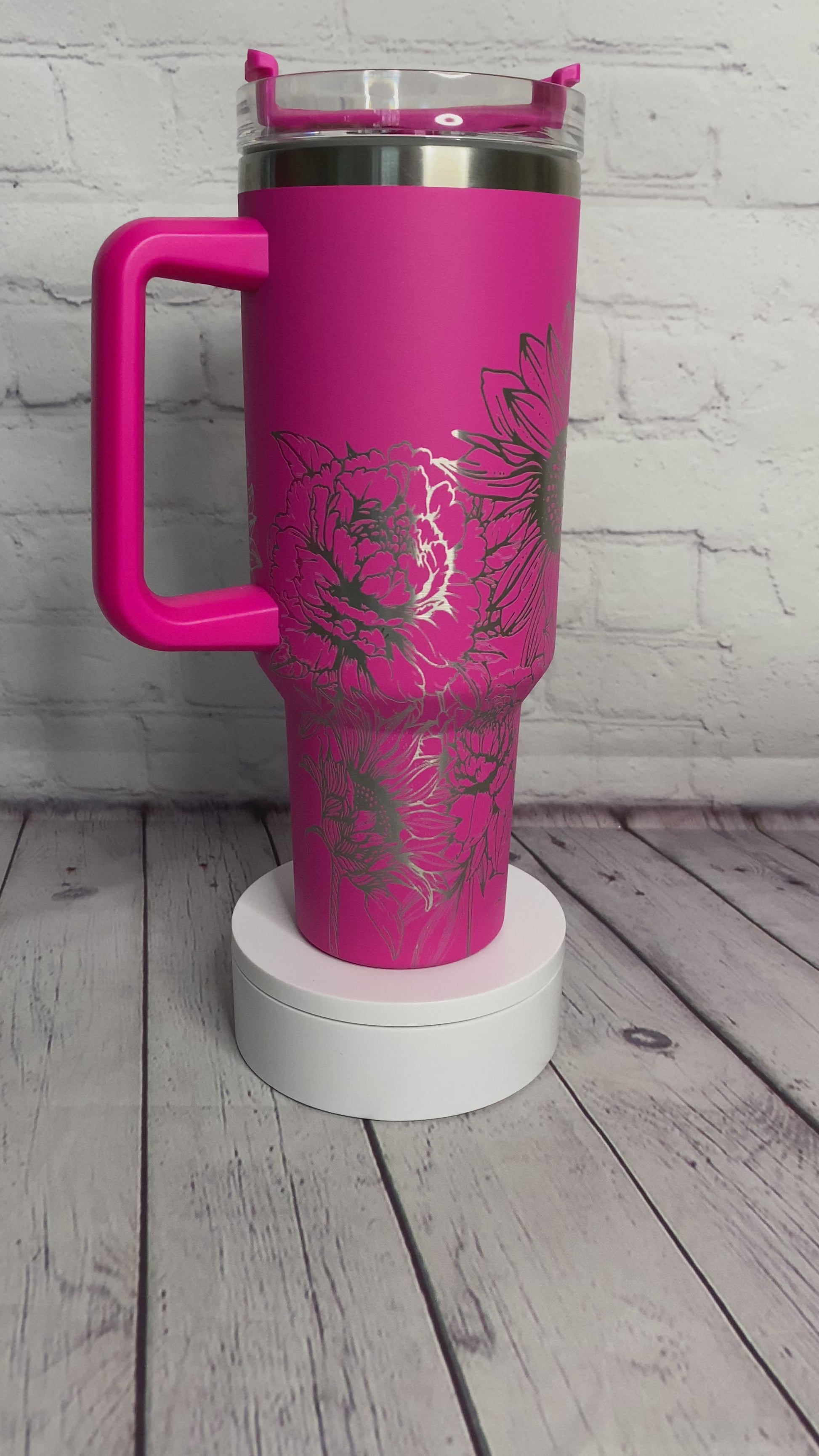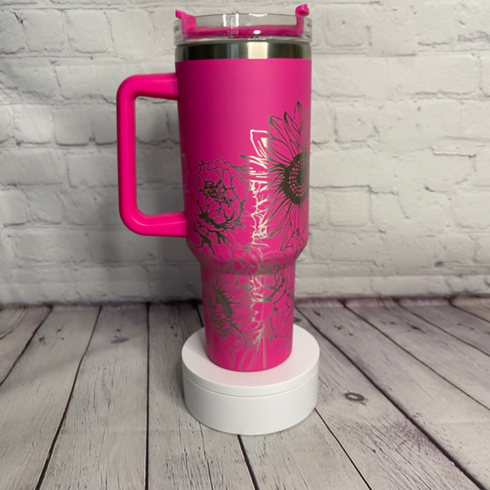 Adorned with the timeless allure of sunflowers and peonies, our tumbler boasts an intricately laser-engraved floral design. This 40oz Pink Tumbler, featuring an exquisite laser-engraved design of sunflowers and peonies. Lid and straw included